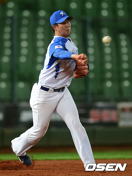 3회초 1사1,2루에서 대표팀 최정이 대만 첸웨이즈의 안타성 타구를 점프해서 잡아내고 2루로 송구, 아웃시키고 있다.