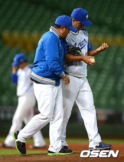3회초 1사 3루에서 대표팀 송승준이 대만 샤오보팅의 타구에 맞아 트레이너와 상태를 확인하고 있다. 샤오보팅의 타구는 송승준에 맞아 굴절되며 내야안타, 동점에 성공했다.