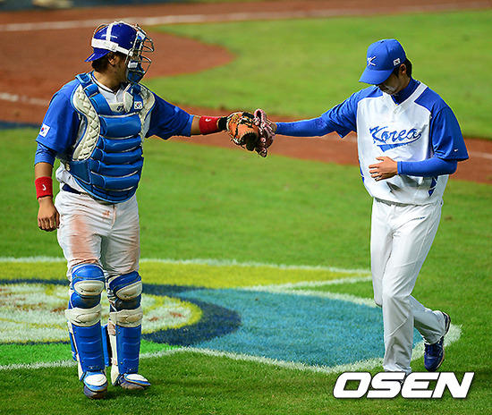 6회초 수비를 마치고 대표팀 강민호와 차우찬이 글러브를 맞대고 있다.