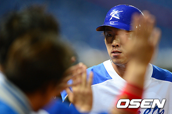6회말 2사 2루에서 대표팀 전준우가 김현수의 1타점 적시타에 홈을 밟고 더그아웃에서 동료선수들과 하이파이브를 하고 있다.
