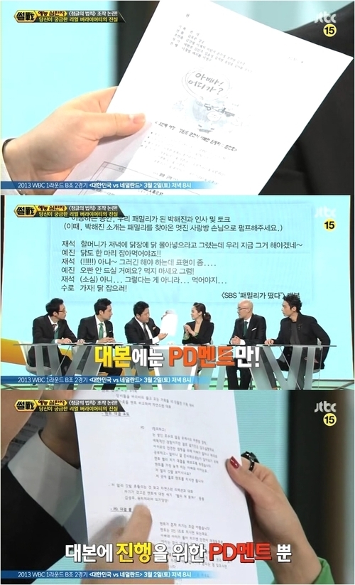 JTBC ‘썰전’은 지난 달 28일 방송에서 버라이어티 프로그램의 조작 논란을 다루던 중 요즘 가장 주목을 받고 있는 ‘아빠 어디가’의 대본을 시청자들에게 보여줬다.