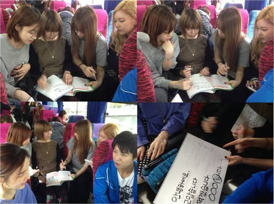 소속사인 코어콘텐츠미디어 측이 1일 공개한 사진에서 티아라는 도쿄에서 시즈오카로 이동 중 한국어 선생님이 돼 간단한 인사말과 우리나라의 표준어를 알려 주고 있다.
