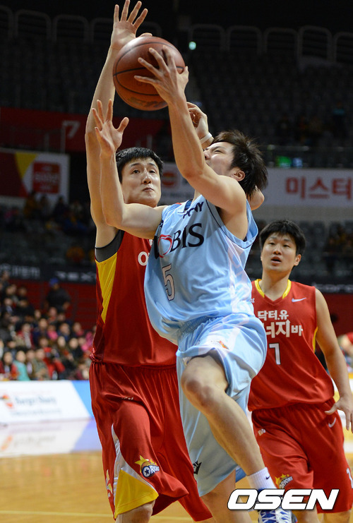 1일 오후 경기 고양체육관에서 열린 KB 국민카드 2012-2013 프로농구 고양 오리온스와 울산 모비스의 경기, 3쿼터 모비스 김시래가 모비스 최진수의 슛블록을 피해 점프슛을 시도하고 있다.