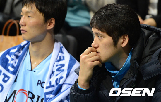 1일 오후 경기 고양체육관에서 열린 KB 국민카드 2012-2013 프로농구 고양 오리온스와 울산 모비스의 경기, 4쿼터 종아리 근육 부상을 당한 모비스 함지훈이 벤치에서 경기를 지켜보고 있다.