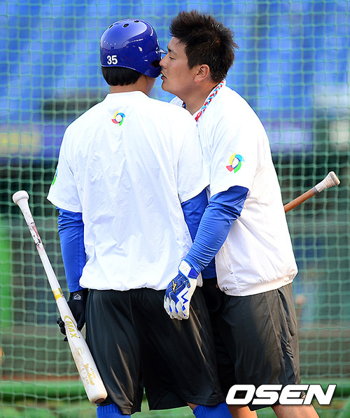 김태균이 배팅훈련을 하며 이진영에 귓속말을 하고 있다.