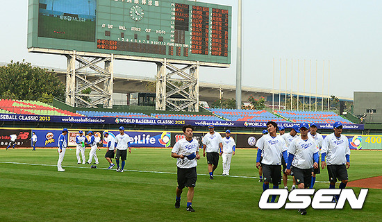 대표팀 선수들이 몸을 풀고 더그아웃으로 향하고 있다.