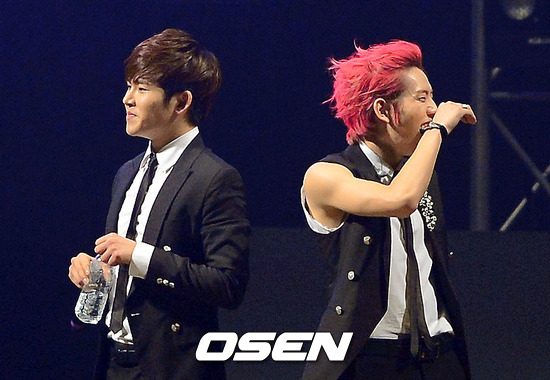 1일 오후 서울 올림픽공원 체조경기장에서 열린 '2013 인피니트 무한대집회'에서 인피니트 멤버 호야와 동우가 미소짓고 있다.