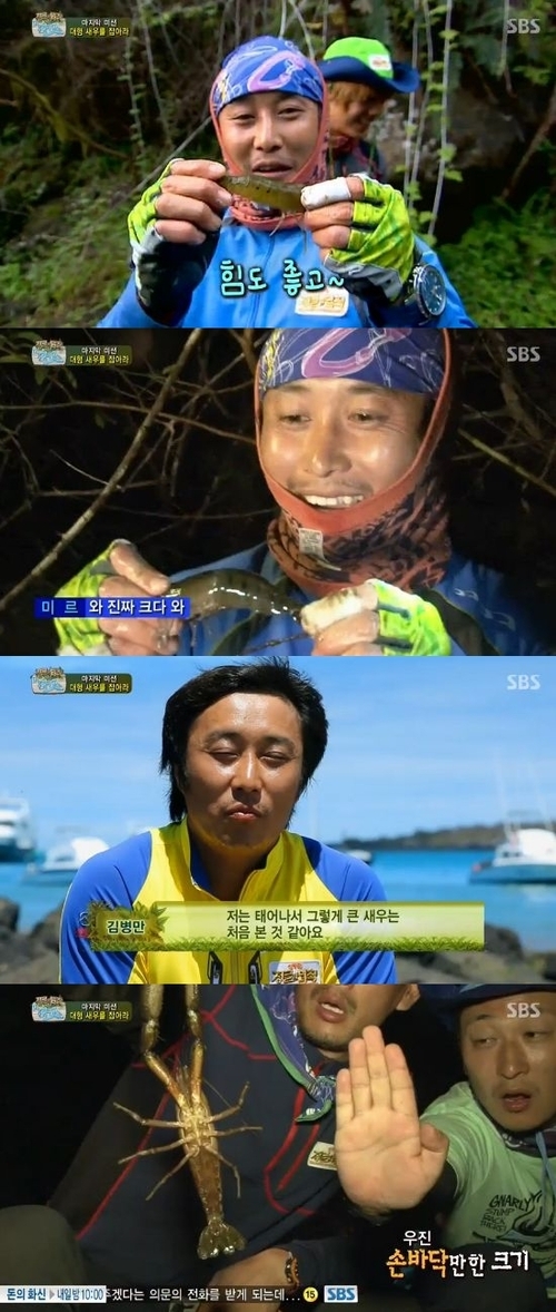 그런 김병만과 미르의 노력이 통했는지 오랜 시간이 지난 후 김병만은 가재만한 새우를 포획했다. 그 때부터 새우는 알아서 두 사람을 찾아오기 시작했고 이들은 “바닷가재만한 새우”라고 외치며 기뻐했다.