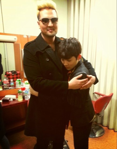 그룹 틴탑 리키가 가수 김태우의 품에 안긴 사진을 공개, 큰 체격 차이로 웃음을 자아냈다.