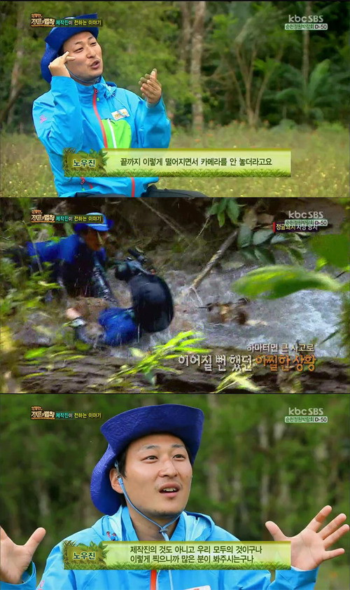 당시 방송에서 그는 외나무다리를 건넜고, 이후 자신의 뒤를 따르면 김정현 VJ가 다리를 건너는 것을 돕다 동반 추락하는 사고를 겪었다.