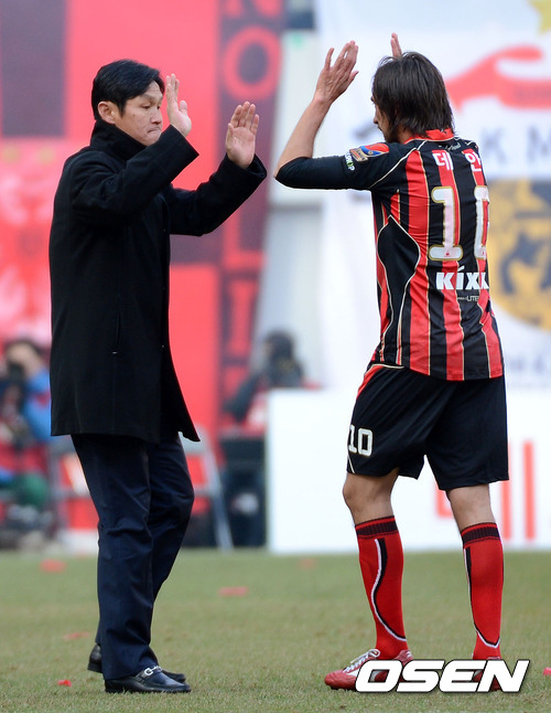 2일 서울 성산동 서울월드컵경기장에서 열린 '2013 K리그 클래식' 개막전 FC 서울과 포항 스틸러스의 경기, 전반전 선제골을 성공시킨 서울 데얀이 최용수 감독과 하이파이브를 하고 있다.