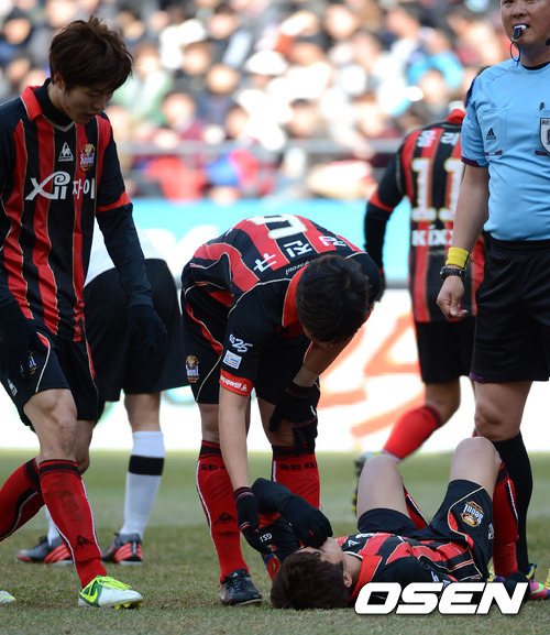 2일 서울 성산동 서울월드컵경기장에서 열린 '2013 K리그 클래식' 개막전 FC 서울과 포항 스틸러스의 경기, 전반전 서울의 코너킥 상황에서 다리에 고통을 호소한 윤일록이 그라운드에 누워 있다.