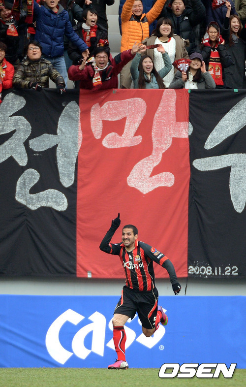 2일 서울 성산동 서울월드컵경기장에서 열린 '2013 K리그 클래식' 개막전 FC 서울과 포항 스틸러스의 경기, 후반전 서울 에스쿠데로가 추가골을 성공시키고 환호하고 있다.