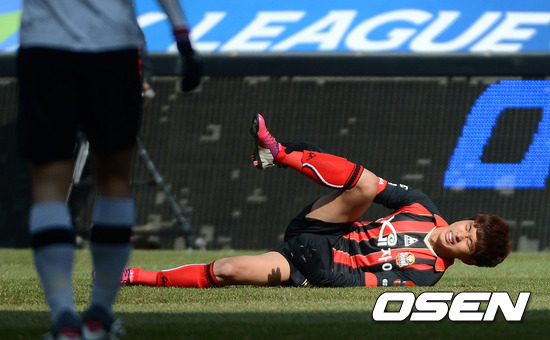 2일 서울 성산동 서울월드컵경기장에서 열린 '2013 K리그 클래식' 개막전 FC 서울과 포항 스틸러스의 경기, 전반전 포항 노병준과 충돌한 서울 윤일록이 고통스러워하고 있다.