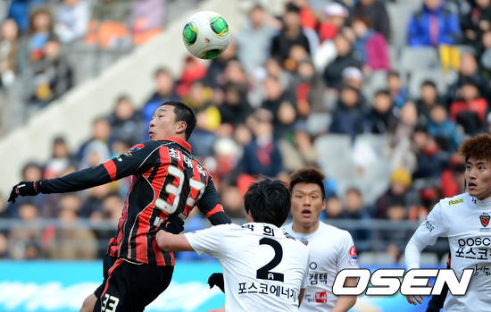 2일 서울 성산동 서울월드컵경기장에서 열린 '2013 K리그 클래식' 개막전 FC 서울과 포항 스틸러스의 경기, 전반전 서울 최태욱이 센터링을 머리로 받아내고 있다.