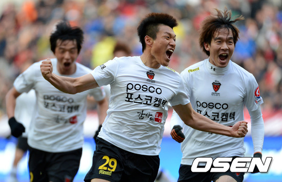 2일 서울 성산동 서울월드컵경기장에서 열린 '2013 K리그 클래식' 개막전 FC 서울과 포항 스틸러스의 경기, 후반전 동점골을 성공시킨 포항 이명주가 동료들과 환호하고 있다.