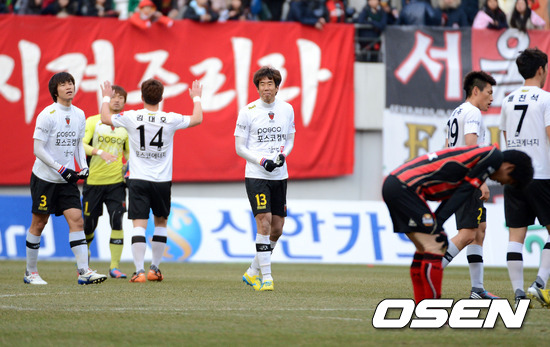 포항 스틸러스는 2일 서울월드컵경기장에서 열린 현대오일뱅크 K리그 2013 개막전 FC서울과 원정 경기서 후반 38분 터진 이명주의 천금같은 동점골에 힘입어 2-2 무승부를 거뒀다. 포항은 이날 무승부로 비록 서울 원정 징크스를 깨는데는 실패했지만, 1-2로 끌려가던 후반 총공세 속에서 터진 지난 시즌 신인왕의 벼락골로 패배를 피하게 됐다.