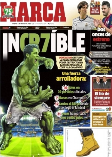 스페인 언론 마르카는 영화 '인크레더블 헐크'를 인용해 '인크레더블 CR7'이라는 기사를 게재하며 최근 호날두의 활약상을 높이 평가했다.