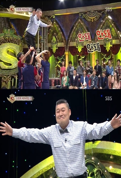 하지만 전문치어리딩팀답게 빅타이드의 기술은 강호동을 순식간에 사람 키높이 만한 공중 위로 들어올려 탄성을 자아냈다. 오히려 강호동은 높아진 위치에 어쩔 줄 몰라하며 "안돼 안돼"를 한 없이 외쳐 웃음을 안겼다.