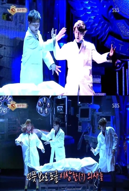 타임머신은 이날 수술실을 배경으로 오싹한 느낌을 자아내는 퍼포먼스를 펼쳐 큰 박수를 받았다. 이들은 침대 위에 환자를 눕히고 이를 집도하는 의사로 변신해 절도 있는 댄스 동작으로 수준 높은 공연을 완성했다.