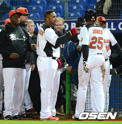2회말 2루타를 치고 나가 첫 득점을 올린 앤드류 존스가 동료의 환영을 받고 있다./jpnews@osen.co.kr