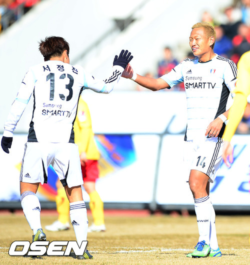 3일 오후 성남 탄천종합운동장에서 열린 성남 일화와 수원 삼성의 현대오일뱅크 K리그 클래식 2013 수원과의 개막전에서 후반 공격을 시도한 정대세가 서정진과 하이파이브를 하고 있다.