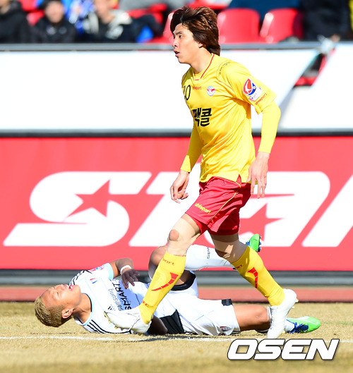 3일 오후 성남 탄천종합운동장에서 열린 성남 일화와 수원 삼성의 현대오일뱅크 K리그 클래식 2013 수원과의 개막전에서 수원 정대세가 볼 다툼 중 넘어지고 있다.