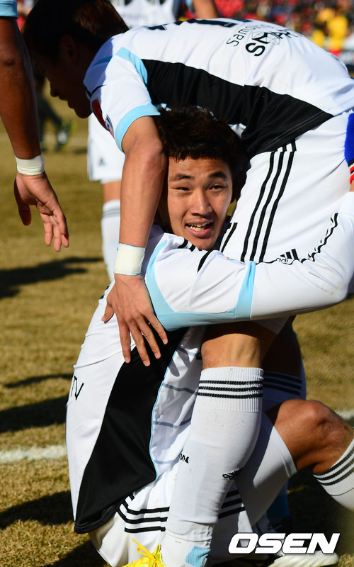 3일 오후 성남 탄천종합운동장에서 열린 성남 일화와 수원 삼성의 현대오일뱅크 K리그 클래식 2013 수원과의 개막전에서 후반 조동건이 팀 추가골에 성공 한 후 홍철과 포옹을 하고 있다.