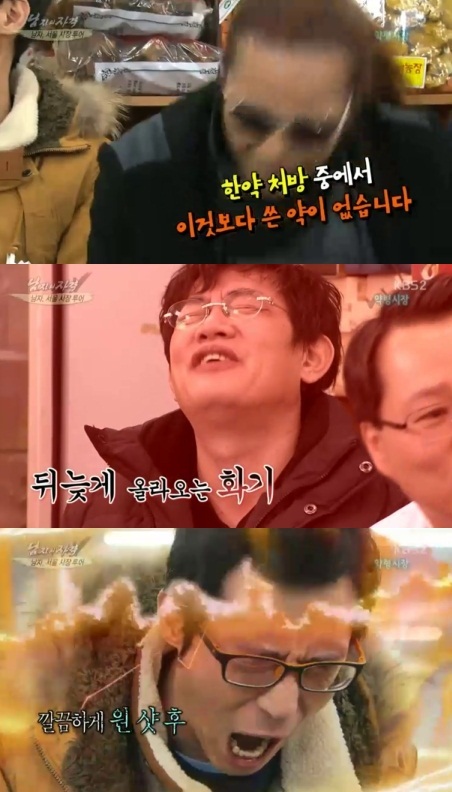 약재시장을 찾은 멤버들이 몸에는 좋지만 입에는 쓴 한약에 몸서리를 쳤다.