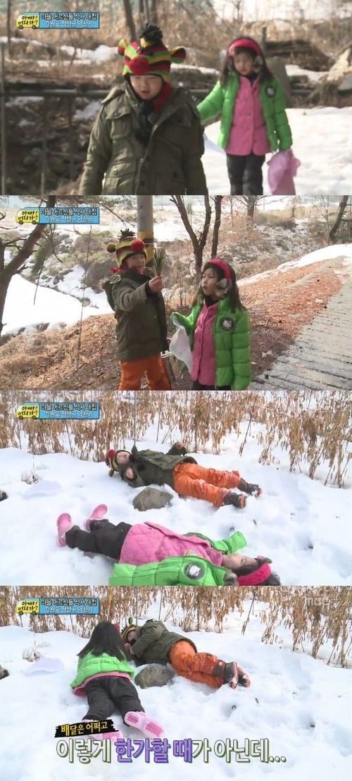 완성된 음식을 갖고 길을 떠난 윤민수의 아들 후와 송종국의 딸 지아는 배달은 안중에도 없이 둘만의 시간에 몰입하는 모습이었다. 눈이 쌓인 길을 걸으며 "가을이 된 거 같다. (풍경이) 너무 아름답다"며 감성 충만한 멘트를 내뱉는 후의 모습이 엉뚱해 웃음을 자아냈다. 결국 무거운 냄비와 짐을 들고 가던 후와 지아는 어느새 지친 듯 배달이라는 본연의 임무를 잊고 주위 풍경에 정신이 팔려 수다를 떨기 바빴다. 눈이 소복이 쌓인 길에 나란히 드러눕기 까지, 마치 설원 위 연인의 데이트를 연상시키는 그림을 만들어내며 웃음을 선사했다.