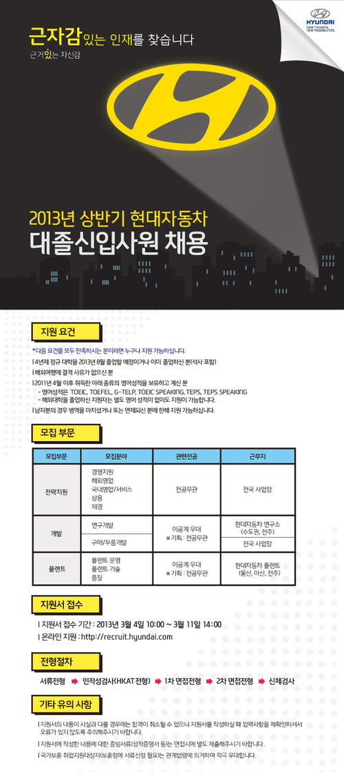 현대차는 2013년 상반기 대졸 신입사원 채용 지원서를 3월 4일부터 11일까지 현대차 홈페이지를 통해 접수 받는다. 지원서 접수는 현대차 인터넷 채용 홈페이지를 통해 진행되며, 4년제 정규대학 2013년도 8월 졸업예정자 및 기 졸업자에 한해 지원할 수 있다.