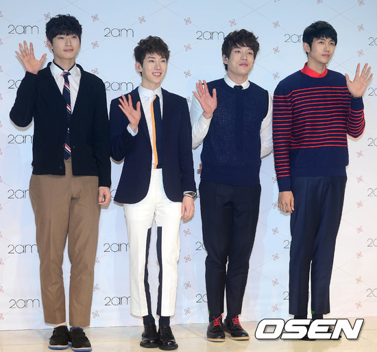 4일 오후 서울 청담동 일지아트홀에서 열린 2AM 기자간담회에서 멤버들이 포토타임을 갖고 있다.