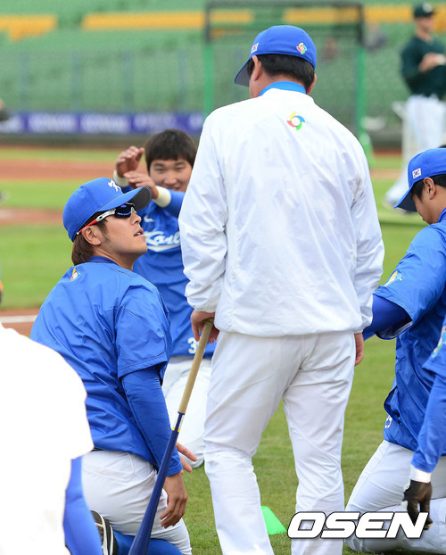 경기에 앞서 대표팀 류중일 감독이 강민호와 이야기를 나누고 있다. 강민호는 네덜란드전에서 부상으로 진갑용과 교체됐다.