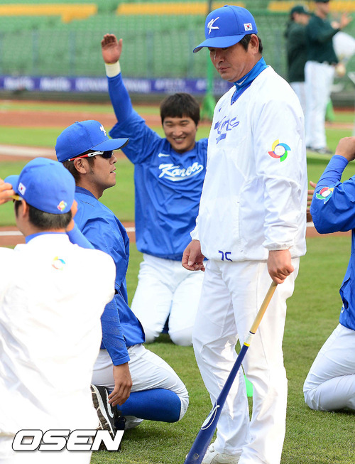 경기에 앞서 대표팀 류중일 감독이 강민호와 이야기를 나눈 후 돌아서고 있다. 강민호는 네덜란드전에서 부상으로 진갑용과 교체됐다.