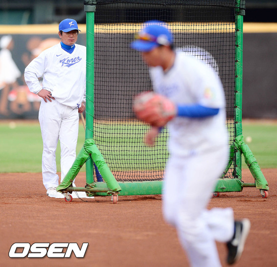 경기에 앞서 대표팀 류중일 감독이 선수들의 훈련상황을 지켜보고 있다.