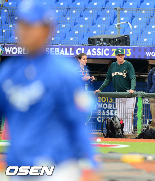 경기에 앞서 호주 대표팀 옥스프링(전 LG트윈스)이 한국 대표팀의 훈련을 지켜보고 있다.