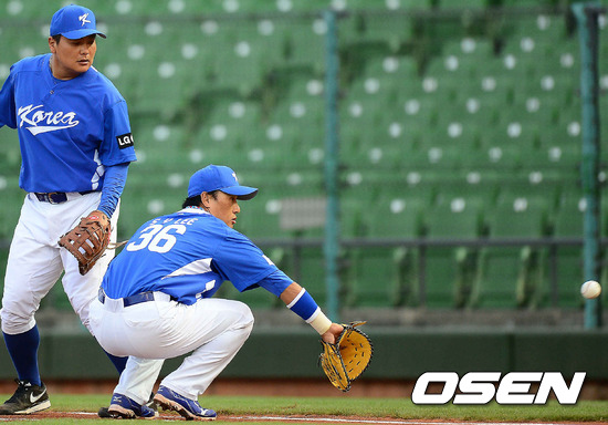 경기에 앞서 훈련 중 대표팀의 김태균과 이승엽이 1루수 수비 훈련을 하고 있다.