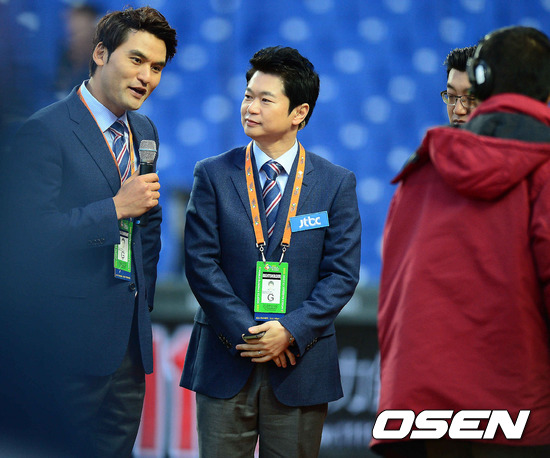 해설자로 변신한 박찬호가 중계를 준비하고 있다.