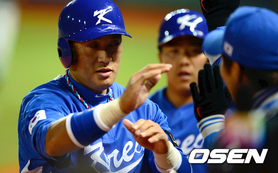 1회초 2루타를 치고 김현수의 안타때 홈을 밟은 이승엽이 동료들의 환영을 받고 있다.