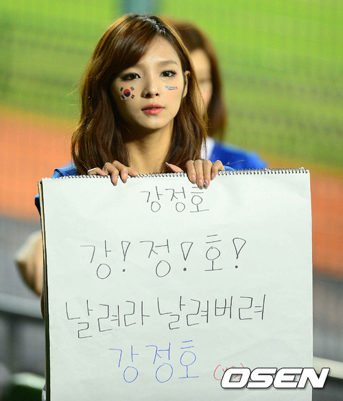 치어리더가 '강정호 날려버려'가 적힌 플래카드를 들고 응원을 하고 있다.