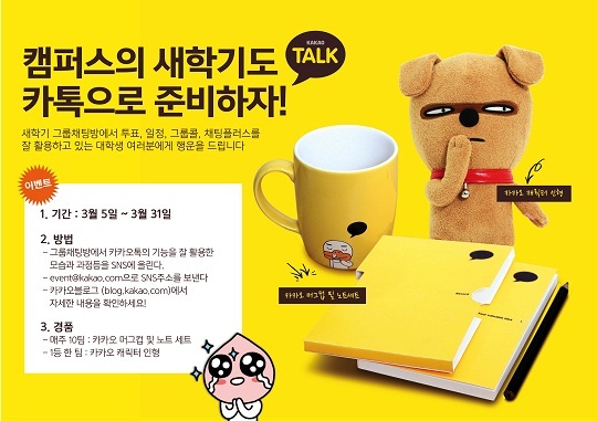이벤트 참여 방법은 간단하다. 오는 3월 말일까지 학교 친구들과 카카오톡 그룹채팅방 활용 사례와 경험담을 블로그, 트위터, 페이스북 등 다양한 SNS에 올리고, 해당 SNS 주소를 event@kakao.com으로 전송하면 응모가 완료된다.