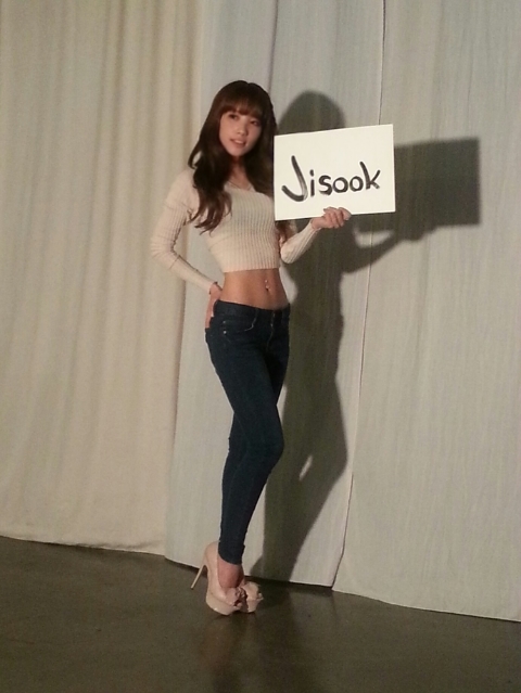 사진 속 지숙은 자신의 이름이 적힌 종이를 들고 한 쪽 다리를 구부린 포즈를 취하고 있다. 탄탄한 복근과 청바지의 라인으로 드러나는 날씬한 각선미가 돋보이는 모습이다.