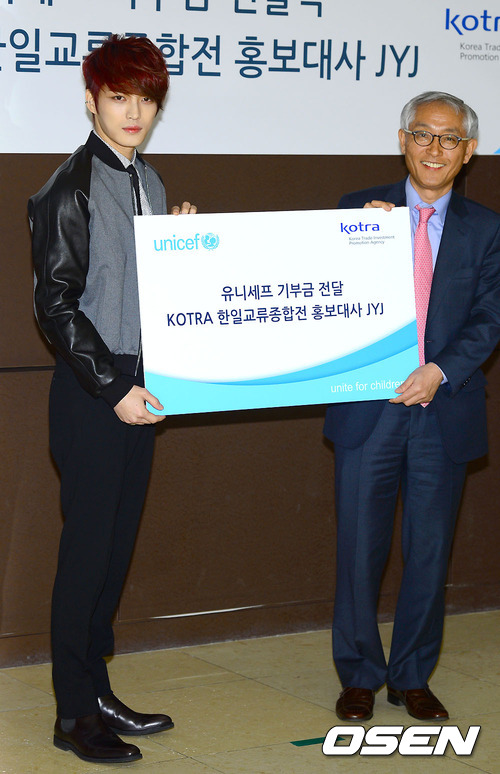 JYJ(김재중·박유천·김준수)는 '2012 한일교류종합전' 출연료를 전달했다. 이날 전달식에 JYJ 대표로 참석한 김재중은 "유니세프 기부를 통해 세계 빈곤층 아이들에게 따뜻한 마음을 전하고 싶다"며 뜻을 전했다.