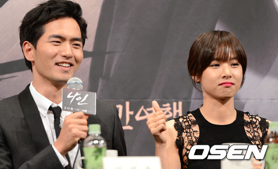 5일 오후 서울 논현동 임피리얼 팰리스 호텔에서 열린 tvN 새 월화드라마 '나인: 아홉번의 시간여행' 제작발표회에서 두 배우의 호흡을 묻는 취재진의 질문에 배우 조윤희가 이진욱을 향해 엄지를 세워 대답을 대신하고 있다.