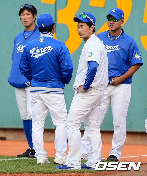 5일 오후 대만 타이중 인터컨티넨탈구장에서 2013 WBC 1라운드 B조 한국과 대만의 경기, 경기에 앞서 유원상, 오승환, 송승준이 훈련 중 이야기를 나누고 있다.