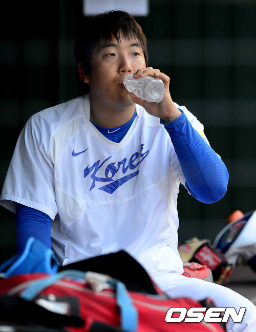5일 오후 대만 타이중 인터컨티넨탈구장에서 2013 WBC 1라운드 B조 한국과 대만의 경기, 경기에 앞서 김현수가 덕아웃에서 물을 마시고 있다.