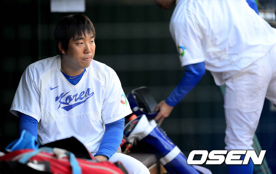 5일 오후 대만 타이중 인터컨티넨탈구장에서 2013 WBC 1라운드 B조 한국과 대만의 경기, 경기에 앞서 김현수가 덕아웃에서 훈련을 준비하고 있다.