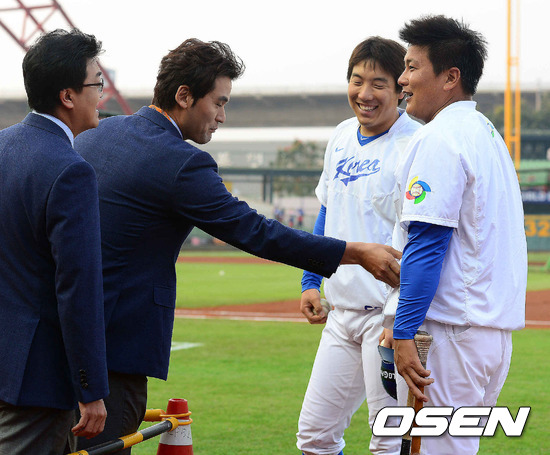 5일 오후 대만 타이중 인터컨티넨탈구장에서 2013 WBC 1라운드 B조 한국과 대만의 경기, 경기에 앞서 박찬호 해설위원이 훈련 중인 김태균의 배를 만지며 농담을 건네고 있다.