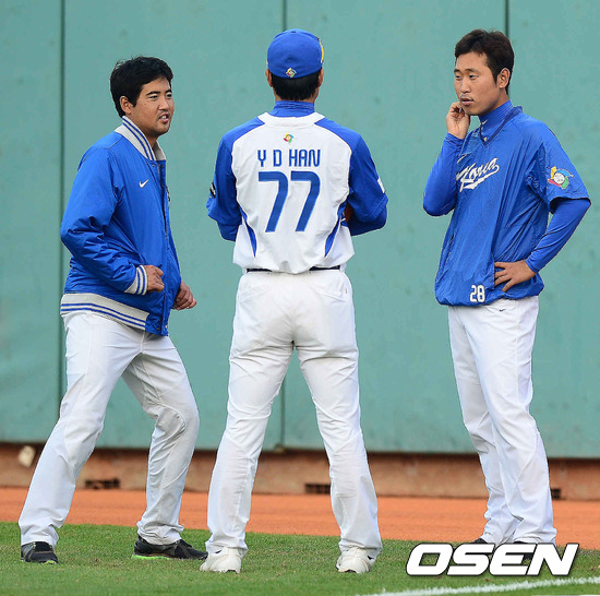 5일 오후 대만 타이중 인터컨티넨탈구장에서 2013 WBC 1라운드 B조 한국과 대만의 경기, 경기에 앞서 장원삼과 윤석민이 한용덕 코치와 이야기를 나누고 있다.