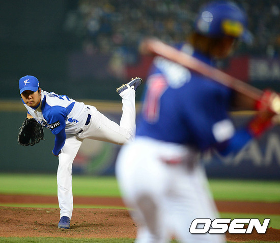 5일 오후 대만 타이중 인터컨티넨탈구장에서 2013 WBC 1라운드 B조 한국과 대만의 경기, 1회초 장원준 선발투수가 역투하고 있다